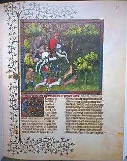 Gaston Phoebus: Das Buch der Jagd[38][39] | um 1405–1410 | Frankreich: Paris | mindestens drei Künstler | Johann Ohnefurcht | Gaston Phoebus: „Das Buch der Jagd“; 87 Miniaturen | Paris, Bibliothèque nationale, Ms. fr. 616 |
