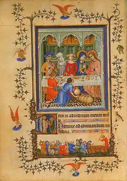 Petites Heures des Herzogs Jean de Berry[20][21] | 1372–1390 (in mehreren Etappen) | Frankreich: Paris | Jean le Noir, Jacquemart de Hesdin; Brüder von Limburg (eine Miniatur) | Jean de Berry | lateinisches Stundenbuch | Paris, Bibliothèque nationale, Ms. lat. 18014 |