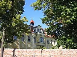 Der Putzbau, dessen Fassadengliederung bis in die 1990er Jahre entfernt war, erhielt bei der Sanierung in den 2000er Jahren wieder eine Gliederung mit Lisenen und Putzfeldern, die farblich unterschiedlich angelegt wurden. Die Fenstergewände und der Erker bestehen aus Sandstein.