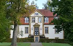 Das 1725 erbaute barocke Herrenhaus mit Mittelrisalit und aufgesetztem Dreiecksgiebel sowie Mansardendach ist vollständig von einer Gräfte umgeben. Die zweiflügelige Haustür mit Barockportal wird über eine Brücke und einer doppelläufigen Freitreppe erreicht. Direkt darunter ist ein zweiter Zugang zum Kellergeschoss, früher der Dienstboteneingang.