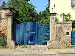 Die Toranlage besteht aus großen Sandsteinpfeilern mit Decksteinen.