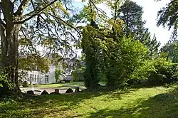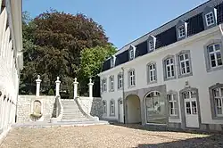 Das Haupthaus bildet mit seinen beiden Flügeln einen großen gepflasterten Innenhof, der gartenseitig mit einer hohen Stützmauer abgeschlossen ist, die mittig Platz macht für eine große fünfzehnstufige Freitreppe als Zugang zum Garten. Links dieser Freitreppe ist in die Stützmauer eine große rundbogige Nische mit einem muschelförmigen Brunnenbecken eingebaut. Auf die Stützmauer aufgesetzt befinden sich vier hohe viereckige mit Flammentöpfen verzierte Blausteinpfeiler, zwischen denen und zu den ersten Obergeschossen der jeweiligen Hausflügel geschwungene schmiedeeiserne Gitter mit Rundeisenstäben und Lanzenspitzen sowie mittig die große schmiedeeiserne Doppelflügeltür eingelassen sind.