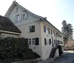 An der Wand des Hauses ist die älteste Version des Zolliker Wappens abgebildet, in dem anstelle des roten Balkens ein Vogel steht.