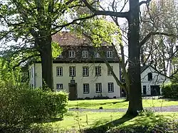 Das umgräftete Herrenhaus aus verputztem Fachwerk ist zum Teil verschiefert. Das Dachgeschoss mit Mansarddach wurde 1923 aufgesetzt. Eingang mit Wappenrelief.