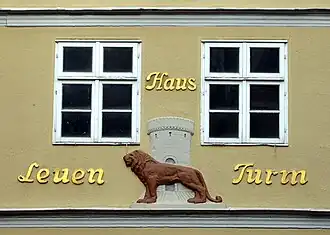 Etwa bis in die Zeit des Zweiten Weltkrieges war ein Wappenschild mit dem Stadtwappen Braunschweigs, dem Braunschweiger Löwen mittig an der Außenwand der zweiten Etage angebracht. Das Haus überstand die zahlreichen Bombenangriffe auf die Stadt weitgehend unbeschädigt. Kurz nach Kriegsende (auf Fotos von 1950 bereits zu sehen)[2] wurde dieses Wappen durch einen vom Betrachter aus nach links blickenden Löwen, der vor einem alten Burg- oder Wehrturm steht, ersetzt. Darüber und daneben findet sich zudem seither die Beschriftung Haus Leuen Turm.