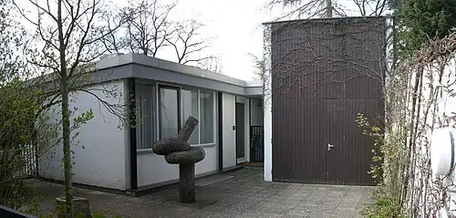 Der Bau ist ein kubisch gegliederter Flachdach-Bungalow. Eine Stahlkonstruktion trägt die Dachplatte und gibt dem gesamten Gebäude den konstruktiven Bezugsrahmen. Geschlossene, offene und halboffene Bereiche gehen ineinander über. Durchbrochen wird die quadratische Rasterung von einer eingezogenen Parabel, die den Wohnraum einfasst und ihn zum Garten hin öffnet.