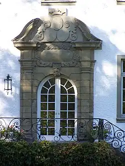 Über dem Hauptportal sind im Sprenggiebel drei neuzeitliche Allianzwappen in jeweils gespaltenem Schild angebracht, oben die Kombination von Rump zur Wenne (Sparren) und von Hanxleden (Maueranker), zwei wichtigen, aufeinander folgenden Besitzerfamilien, heraldisch rechts unten als Ehewappen die Kombination von Lüninck (Sperling) und von Gaugreben-Schönau-Wehr (Schönau: geteilt und drei Ringe, Gaugreben: Pfähle), für Ferdinand von Lüninck und seine Frau, Auguste von Gaugreben-Schönau-Wehr, und schließlich heraldisch links unten als Ehewappen die Kombination von Lüninck (Sperling) und von Salis-Soglio (geteilt, oben eine ausgerissene grüne Weide, unten fünfmal gespalten), für Gottfried Freiherr von Lüninck und seine Frau, Elisabeth geb. Freiin von Salis-Soglio.