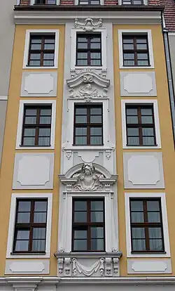 Unter dem Mittelfenster im zweiten Obergeschoss befinden sich kleine lambrequinartige Konsolen. Diese kommen durch flache, rechteckige Plättchen direkt auf der darunter befindlichen Verdachung des Fensters im ersten Obergeschoss zu stehen. Zwischen den Konsolen befindet sich ein konkaves Putzfeld. Über dem Fenster im zweiten Obergeschoss sitzt ein geschweifter Sprenggiebel als Fensterverdachung. Diese rollt sich mit seinen beiden Teilen in der Mitte wie zu Voluten mit einem Akanthusblatt zusammen. Zwischen den beiden nach außen gedrehten Konsolen, die auch diesen Giebel hochhalten, ist Raum für ein großes, geschupptes Feld, in dessen Mitte eine gerippte Muschel mit einer Frauenbüste steht.