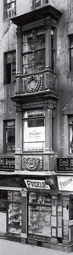 Die Erbauung fiel vermutlich in den Zeitraum um 1535/50. Um 1660/1680 erfolgte ein weitgehender Umbau. Das fünfgeschossige Haus zeigte einen zweigeschossigen Erker, mit ornamental geschmückten Brüstungsplatten und kannelierten Pfeilergewänden. Die Schlagleiste des Erkerfensters im zweiten Obergeschoss war reich ornamental geschnitzt. Beim Abbruch der kriegszerstörten Ruine wurden Bruchstücke des Renaissanceportals geborgen.[1]