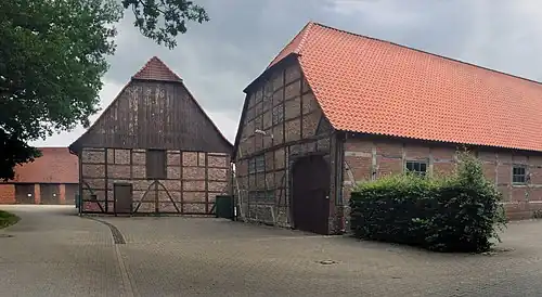 links die Fachwerkscheune aus den 18. Jahrhundert