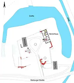 Südlich der rechteckigen Hauptburginsel von 65 × 39 Metern Größe entstand Ende des 16. Jahrhunderts eine Vorburg mit umfangreichem Wirtschaftsbereich. Die 1625 errichtete wehrhafte große Scheune, das sogenannte „Große Vorwerk“, musste in den 1960er Jahren einem Straßenbau weichen.