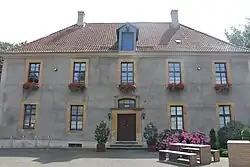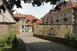 Im Kern stammt das massive Steingebäude aus dem 18. Jahrhundert. Seine Fassade ist ebenfalls grau verputzt. In seinem südlichen Fachwerkanbau aus dem 19. Jahrhundert befindet sich die Stadtbibliothek.[4]
