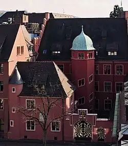 Das etwa 22 Meter hohe traufständige Hauptgebäude erhebt sich auf einem etwas verzogenen rechteckigen Grundriss. Es wurde aus verputztem Bruchsteinmauerwerk errichtet und hat drei Vollgeschosse. Sockel, Portale sowie Gewände an Türen und Fenstern bestehen aus rotem Sandstein. Die Eckquader bestanden ursprünglich ebenfalls aus Sandstein, wurden jedoch während des Umbaus aus Zement rekonstruiert. Das Satteldach ist mit Biberschwanzziegeln gedeckt. Die Giebelwände sind als Staffelgiebel ausgebildet.[57] Die Fassade zur Franziskanerstraße wird von einem spätgotischen Erker aus gelbem Pfaffenweiler Sandstein dominiert, den im zweiten Stock ein Balkon abschließt. Die Fassade ist nicht völlig symmetrisch gestaltet: Der Erker sitzt etwas links von der Mitte, die beiden rechten Fensterachsen sind etwas verschoben. Hier finden sich statt der am Bau sonst auftretenden Kreuzstockfenster zwei gestaffelte dreibahnige Fenster im ersten Obergeschoss. Zwei Gesimse teilen die Stockwerke ab. Das Hauptgesims wurde aus Holz mit steinernem Unterglied hergestellt. Die beim Umbau eingebauten Dachgauben, auf der Vorderseite zehn, auf der Rückseite sechs, sind nicht mehr vollständig erhalten. Heute befinden sich jeweils vier große und zwei kleine Schleppgauben auf den Dachflächen. Der sechseckige Treppenturm trägt eine kupferne Dachhaube. Rinnen, Abfallrohre und Dachspitzen wurden ebenfalls aus diesem Material gefertigt.[58]
