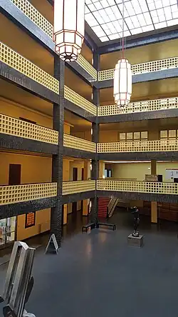 Das Foyer wird in der Mitte von acht Pfeilern unterteilt, die in einem Rechteck angeordnet sind. Diese tragen die Galerie, die sich über fünf Geschosse bis an den höchsten Punkt des Gebäudes erstreckt. Die Galerie sowie die Pfeiler haben ein Stahlskelett als Grundgerüst. Die acht Pfeiler sind außen mit schwarzen, schimmernden Ziegeln ummauert. Die Fugen der Ziegel sind weiß. So werden die einzelnen Ziegel gut sichtbar. Die Brüstungen der Galerien haben gelbe Ziegel, die ein Raster zeigen, das aus regelmäßigen Abfolgen von rechteckigen Löchern besteht. Nur die oberste Reihe, der Handlauf, ist in horizontalen, flachen, schwarzen Ziegeln angefertigt.