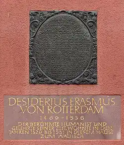 Wie auf einer in der Fassade eingelassenen Steintafel zu lesen ist, lebte der Humanist Erasmus von Rotterdam nach seiner Flucht aus Basel im Hause Villingers, das bei seinem Einzug zu Weihnachten 1529 noch „unvollendet“ war.[16] Erasmus berichtete in einem Brief an Johann Coler († vor 1538)[17] im Frühjahr 1531, dass der Rat der Stadt ihm das Haus überlassen hatte, nachdem er dem Rat durch den damaligen römisch-deutschen König und späteren Kaiser Ferdinand I. empfohlen worden war. Zur selben Zeit wie Erasmus wohnten dort auch die Humanisten und Münsterprediger Otmar Nachtgall und Augustin Marius (1485–1543). Beide zogen bald aus, Nachtgall blockierte jedoch das Erdgeschoss des Hauses,[18] für das er den Schlüssel besaß. Die Situation verkomplizierte sich, als der Stadtrat durch Heinrich Glarean mit Erasmus Mietverhandlungen begann. Erasmus hatte bis dahin angenommen, die Stadt habe ihn mietfrei wohnen lassen, ihr jedoch aus Höflichkeit fünf Kronen für sich und weitere vier für Marius bezahlt. Einen Mietvertrag mit Ursula, der Witwe Villingers, wollte er jedoch nur abschließen, wenn er das komplette Haus allein bewohnen hätte dürfen[19] und nicht nur das Obergeschoss.[18]