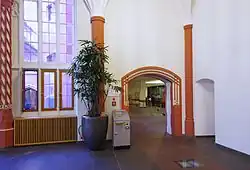 Ein Treppenturm mit einer Wendeltreppe wurde im 18. Jahrhundert abgerissen und als Ersatz eine Eichen-Treppe in die Halle eingebaut. Dabei wurden Teile des gotischen Portals vom ersten Obergeschoss zur Wendeltreppe abgeschlagen. Im Rahmen des Umbaus von 1909 bis 1911 wurde jedoch der Ursprungszustand wiederhergestellt, wobei die Wendeltreppe eine veränderte Drehrichtung erhielt und die Eichentreppe in den westlichen Flügelbau versetzt wurde.[59]