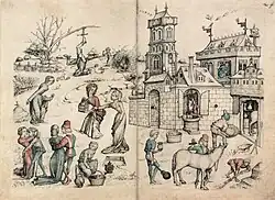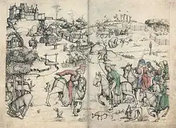 Das Mittelalterliche Hausbuch von Schloss Wolfegg ist ein um etwa 1480 von mehreren Künstlern und Schreibern vermutlich am Mittelrhein geschriebenes und illustriertes handschriftliches Kompendium zu verschiedenen Themen des für einen Adeligen und Familienvorstand nützlichen praktischen Wissens. Berühmt ist das Hausbuch jedoch vor allem für seine lebendigen Bilder, um deren Urheber unter dem Notnamen Meister des Hausbuches eine intensive Diskussion geführt wird.[1] Die figurenreichen Zeichnungen gewähren einen lebendigen Einblick in das Alltagsleben am Übergang vom Spätmittelalter und Früher Neuzeit.