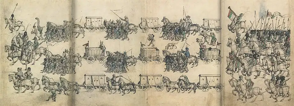 Auf einer großen ausklappbaren Schautafel (fol. 51v–52r1) ist ein Heerzug mit drei Reihen von Wagen abgebildet (in der Mitte der Provianttransport, außen bewaffnete Wagen), die von einem Tross Reiter gefolgt werden. Die Standarte des Trosses trägt das Habsburger-Motto A.E.I.O.U.