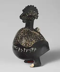 In der forschungsgeschichtlichen Vergangenheit wurde das Haushuhn teilweise in einem sehr frühen, mitunter neolithischen Zusammenhang berichtet. Dies betrifft vor allem einige südosteuropäische Fundstellen mit Alterswerten um 5000 bis 4000 v. Chr. Die Überzeugung war kongruent zu der Annahme einer sehr frühen Domestizierung des Haushuhns in China und einer möglichen Ausbreitung über Zentralasien. Die meisten Knochenfunde von Haushühnern wurden allerdings nur relativ datiert, also im Schicht- und Fundzusammenhang der jeweiligen archäologischen Befunde.[42] Im Jahr 2022 vorgenommene absolute Datierungen an mehreren Funden des Haushuhns aus verschiedenen Bereichen Europas ergaben aber für diese sehr alten Reste, dass es sich zumeist um moderne Einschlüsse in den archäologischen Kontext handelt. Demnach lassen sich die bisher ältesten eindeutigen Funde des Haushuhns in Europa aus Italien nachweisen, so aus Forcello im Norden des Landes mit Radiokarbon-Alterswerten um 770 v. Chr.[43] Einen möglicherweise älteren Nachweis, jedoch ohne absolute Altersmessung, könnten einige Knochenreste aus einem Grab der Latialen Kultur des 9. Jahrhunderts v. Chr. im ebenfalls norditalienischen Montecucco liefern.[44] Es wird vermutet, dass griechische Händler das Haushuhn aus dem nördlichen Afrika mitbrachten, da zumindest für die phönizischen Küstengebiete ähnlich alte Funde dokumentiert sind.[43] Das sporadische Auftreten des Haushuhns im südlichen Europa deckt sich mit dem Umstand, dass die Vögel im griechischen Kulturraum bei Homer (ca. 800 v. Chr.) noch nicht erwähnt werden. Sie finden sich verstärkt erst später auf schwarzfigurigen Vasen. Ebenso werden sie im Nachfolgenden gelegentlich von den Etruskern benannt. In diesen Zusammenhang gehört auch das Bucchero-Hähnchen von Viterbo, eine als Gefäß dienende etruskische Keramikfigur aus dem 7. Jahrhundert v. Chr.[44] Das Haushuhn im südlichen Europa der Antike hatte damals aber noch keine Nahrungsrelevanz, sondern vermutlich eher symbolischen Charakter. So wurden die Tiere für den Hahnenkampf gehalten, was nicht nur schriftlich, sondern auch bildlich überliefert ist, oder dienten als Kennzeichen auf den Schilden der Krieger. Einigen späteren althistorischen Berichten ist dabei zu entnehmen, dass offensichtlich schon mehrere Phänotypen bestanden. Unterscheidbar waren Typen mit langen bartartigen Federn an den Kopfseiten und unterhalb des Schnabels sowie mit Rosenkamm. Bei beiden handelt es sich um Ergebnisse von Mutationen, im ersteren Fall der sogenannten MB-, im letzteren der R-Muatation.[45][44][43][30]
