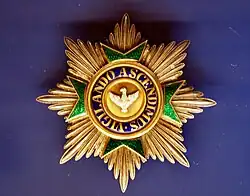 Der Orden besteht aus einem an einer Krone hängenden goldgefassten grün emaillierten Malteserkreuz. In den Kreuzarmwinkeln zeigt sich je ein rot emaillierter geschuppter Stern mit goldener Einfassung. Auf der Vorderseite liegt ein weiß emaillierter Falke mit ausgebreiteten Schwingen. Die Kreuzrückseite zeigt auf weißer Emaille einen grünen Stern, ein ovales Medaillon mit einem emaillierten Blau zeigte in goldenen Buchstaben die vierzeilige Ordensdevise VIGILANDO ASCENDIMUS (wachsam steigen wir empor). Alles wird von einem goldenen Lorbeerkranz und einer Krone umgeben.