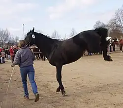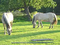 Am Übergang der Antike ins Mittelalter, also in der Völkerwanderungszeit nahm die Größe der Pferde geringfügig zu. Aus den zahlreichen Pferdegräbern dieser Zeit ergibt sich eine Widerristhöhe von etwa 120 bis 150 cm. Spätestens seit dem 8. Jahrhundert lässt sich eine gezielte Zucht von Streitrossen[30] beziehungsweise Gebrauchspferden, etwa Zeltern nachweisen.[29] Im frühen Mittelalter breitete sich der Steigbügel allmählich in Mitteleuropa aus, der vermutlich von den Awaren eingeführt wurde, aber sich offenbar nur allmählich verbreitete.[31]