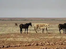 Hauptsächlich in Mittel- und Westasien basierten einige der örtlich bestehenden archäologischen Kulturen des Spätneolithikums und der Frühbronzezeit weitgehend auf der Nutzung der Pferde als Rohstoffquelle, nicht nur zu Nahrungszwecken, sondern auch für die Werkzeugherstellung. Zu den bekanntesten Kulturgruppen, die das Pferd nutzten, gehören die Chwalynsk-Kultur in Russland, die Jamnaja-Kultur und die Botai-Kultur in Nord-Kasachstan. Diskutiert wurde lange, ob die genutzten Pferde Wildfänge oder domestizierte Tiere waren. Zumindest die Pferde der sich um 3500 v. Chr. herausformenden Botai-Kultur weisen für Trensen typischen Abnutzungsspuren an den Prämolaren auf, was auch auf eine Verwendung zum Reiten deuten kann, was die Beweglichkeit beim Hüten und Aufenthaltswechsel erheblich erleichtert hätte.[12][13][14][15] Der Ansicht wird teilweise widersprochen.[16] So ergab eine anhand von Pferdefragmenten aus der Botai-Kultur durchgeführte Untersuchung im Jahr 2018, dass diese eventuell früh domestizierten Pferde nicht in der Linie der heutigen Hauspferde stehen und stattdessen die Basis des Przewalski-Pferdes bilden, das lange Zeit als ursprüngliche Wildform des Hauspferdes galt.[17] Librado et al. (2021) stellten fest, dass alle heutigen Hauspferde auf Mutationen südlich der Unterläufe des Don und der Wolga um etwa 3000 v. Chr. zurückgehen. Dort herrschte um diese Zeit die spätneolithische Jamnaja-Kultur, südlich davon die Maikop-Kultur.[18][19] Im Laufe der Zeit wurden immer wieder regional Wildformen eingekreuzt.[20][21] DNA-Analysen an Funden pleistozäner und frühholozäner Wildpferde und an Hauspferden des Neolithikums sowie der Bronze- und Eisenzeit erbrachten eine relativ hohe Farbvielfalt, die sich vermutlich erst in der Domestikation und Zucht herausgebildet hat.[22][23] Zu einem ähnlichen Ergebnis kam bereits eine Studie aus dem Jahr 2019, die darauf hinwies, dass bei heutigen Hauspferden ein bedeutender Einfluss persischer Tiere besteht, der sich erst im letzten Jahrtausend durch die teils starke islamische Prägung einiger Regionen Europas herausgebildet habe. Außerdem führten moderne Zuchtpraktiken zum Rückgang der Diversität bei den Hauspferden.[18] Mitunter geschah dies aber auch schon in fernerer Vergangenheit, wie dies am Beispiel der „leopardfleckigen“ Pferde (hauptsächlich weiße Tiere mit schwarzen Flecken, Typ Tobiano) gezeigt werden konnte. Diese sind genetisch seit dem ausgehenden Pleistozän bekannt und fanden auch Einzug in den Genpool früher Hauspferdepopulationen seit dem mittleren Neolithikum. In der Folgezeit verschwanden sie aber mehrfach und wurden offensichtlich wieder erneut eingeführt. Ein Grund für das mehrfache Wegzüchten dieses Merkmals könnte darin liegen, dass der Nachwuchs unter Umständen nachtblind ist und dadurch eventuell leichter Raubtieren zum Opfer fällt.[24][23]