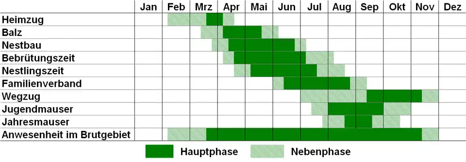 Die Jahresmauser ist eine Vollmauser in der für Singvögel üblichen Abfolge und findet in Mitteleuropa zwischen Mitte Juli und Mitte Oktober statt. Die Dauer der Handschwingenmauser beträgt 50 Tage und liegt im für Kurzstreckenzieher normalen Bereich.[7]