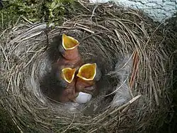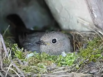 Die Jungvögel schlüpfen weitgehend synchron, oft innerhalb weniger Stunden. Die Eischalen werden unmittelbar nach dem Schlupf ausgetragen, der Kot wird in den ersten Tagen gefressen und die Nestlinge werden vom Weibchen gehudert. Später werden die Kotballen der Jungen in erheblicher Entfernung vom Nest abgelegt, dieser beträchtliche energetische Aufwand wird als Abwehrstrategie gegen Nesträuber gedeutet.[37]
