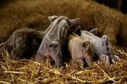 Bei Schweinen beträgt die Trächtigkeits­dauer etwa 112 bis 114 Tage (drei Monate, drei Wochen, drei Tage); der anschließende Geburtsvorgang wird Ferkeln oder auch Abferkeln genannt.