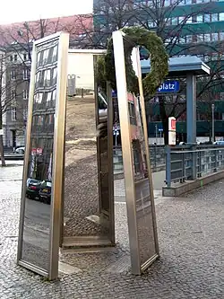 Eine 1992 gegründete Initiativgruppe engagierter Intellektueller setzte sich für ein Denkmal ein, das am Hausvogteiplatz an die Verfolgung jüdischer Mitbürger während der Zeit des Nationalsozialismus erinnern soll. Zunächst wurde 1994 eine provisorische Informationssäule aufgestellt. Den 1995 ausgelobten begrenzten künstlerischen Wettbewerb gewann der Berliner Rainer Görß, die Jury schlug seine Arbeit der Senatsverwaltung für Stadtentwicklung zur Ausführung vor. Am 10. Juli 2000 übergab der zuständige Senator Peter Strieder das fertiggestellte Denkzeichen Modezentrum Hausvogteiplatz der Öffentlichkeit.[10] Die Gesamtkosten betrugen 180.000 Mark und wurden aus dem Etatposten „Kunst im Stadtraum“ finanziert.