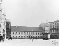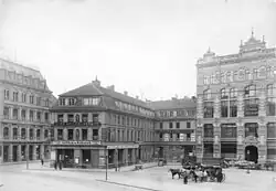 Inzwischen hatte sich rings um den Platz die Konfektionsindustrie entwickelt. 1891 wurde die alte Hausvogtei abgerissen, das Grundstück zur Erweiterung der anliegenden Reichsbank[4] genutzt. Als Platzrandbebauung entstanden zunehmend vierstöckige Gebäude, wichtige Zeugnisse für die Architektur des späten 19. Jahrhunderts. Die Geschäftshäuser mit den Hausnummern 3–4, 8–9 und 12, alle in den 1890er Jahren gebaut, sowie das 30 Jahre später entstandene Haus Nr. 1 stehen unter Denkmalschutz. In den Jahren 1877/80 und 1885 wurden verschiedene Pläne für die Neugestaltung des Platzes ausgearbeitet. Die Inhaber der umliegenden Geschäfte sprachen sich gegen die Bepflanzung aus – sie befürchteten, Bäume würden den ungehinderten Blick auf ihre Firmenschilder versperren. Freilich gab es zunächst gar keine Finanzmittel für die geplanten Veränderungen, erst 1890 konnte an der Grünanlage weiter gearbeitet werden. Das damalige Ergebnis: eine dreieckige Rasenfläche, bepflanzt mit Bäumen und Sträuchern, am Rande zwei halbrunde Bänke, im Zentrum der Springbrunnen.