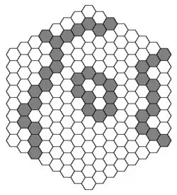 - Es wird auf einem sechseckigen Brett aus sechseckigen Feldern gespielt. Man findet 271 Felder, wenn an jeder Seite des Bretts zehn Felder liegen. Andere Brettgrößen sind aber ebenso möglich. Weit verbreitet sind 8 Felder Kantenlänge, was insgesamt 169 Felder ergibt. Das Bild zeigt gerade ein Brett mit acht Feldern an jeder Seite.