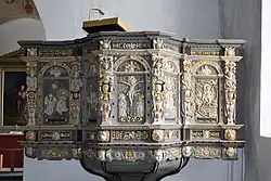 Die reich verzierte Spätrenaissance-Kanzel von ca. 1625 besteht aus sieben Fächern, deren Reliefs folgende Motive zeigen: 1) Relief im Nordfach verloren, vielleicht Sündenfall, Fach später mit einem A unter einer Herzogskrone ausgemalt; 2) Mariae Verkündigung; 3) Jesu Geburt; 4) Golgatha; 5) Jesu Taufe; 6) Auferstehung; 7) das Südfach ist ohne Relief zur Wand gerichtet. In den Friesfeldern ober- und unterhalb der Reliefs stehen stark abgekürzte niederdeutsche Inschriften, welche die Motive benennen. Die Ecken der Fächer zeigen Hermen, welche verschiedene Tugenden symbolisieren, darunter der Glaube mit Kerze, die Hoffnung mit Kind und Blumenvase, die Gerechtigkeit mit Schwert und Waagschale, die Liebe mit einem Kind in jedem Arm und die Geduld mit einem Lamm im Schoß. Unter dem Nordfach steht die Jahreszahl 1679, die sich auf eine neue farbliche Fassung der Kanzel bezieht; drei weitere Fassungen folgten später (1760, 1771, 1841).[7]