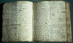 Kirchenbuch Havnbjerg, Beginn. Links das von Pfarrer Beyerholm mit einem barocken Vanitas-Gedanken nachträglich gestaltete Titelblatt (ca. 1647), rechts die ersten Eintragungen seines Vorgängers Christian Brunckertzen 1606