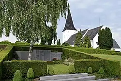 Der Friedhof ist, wie in Dänemark häufig, um die Kirche herum angelegt. Ungewöhnlich ist dabei aber, dass der Friedhof die Geographie des Kirchspiels widerspiegelt: In seinem älteren Teil liegen die Gräber nämlich so, dass sie in die Himmelsrichtung des Dorfes bzw. Wohnortes der Verstorbenen zeigen. Auf dem Friedhof befinden sich Gedenksteine für die Gefallenen der Schleswigischen Krieges 1848–1851 und des Deutsch-Dänischen Krieges 1864. Eine hohe Steinsäule (1921) nennt die Namen der Toten des Ersten Weltkriegs. Der Tod von 40 jungen Männern aus einer Gemeinde von ca. 800 Seelen war 1914/1918 ein enormer und schwer zu verkraftender Blutzoll.[33][34]
