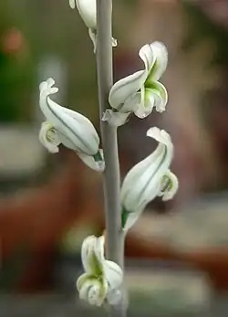 Der Blütenstand erreicht eine Länge von bis zu 30 Zentimetern und besteht aus 15 bis 20 weißen Blüten.