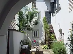 Ein breites Tor mit angedeuteten Pilastern führt durch das Haus in einen kleinen Innenhof. Der Hof ist vom linken Nachbargrundstück durch eine Mauer getrennt. Diese paarige Anlage der Höfe findet sich bei mehreren Grundstücken der Joseph-Haydn-Gasse. Rechts schließt sich an das Vorderhaus ein Seitengebäude an, das zu einem abschließenden Hintergebäude führt. Dieser hintere Abschluss grenzte ehemals an die alte Stadtmauer Eisenstadts. Eine Freitreppe führt zu den auch von innen zugänglichen oberen Räumen.
