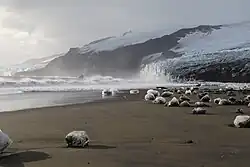 Die Insel Heard ist sowohl karstig als auch vulkanisch. Etwa 70 % der Inseloberfläche sind mit Eis bedeckt.[6] Ein 2025 veröffentlichtes Gletscherinventar zählte auf Heard 29 Gletscher, davon einige kleine auf der Laurens-Halbinsel und 19 am Big Ben, die bis zu 32,3 km² groß sind. Darunter sind (aufgeführt von Norden aus im Uhrzeigersinn): Downes, Ealey, Compton, Brown, Stephenson, Winston, Fiftyone, Deacock, Gotley, Lied, Abbotsmith, Allison, Vahsel, Schmidt[7], Baudissin, Challenger und Mary-Powell. Die Entwicklung der Gletscher gilt als Indikator für die Klimaerwärmung; 1947 reichten sie noch bis zum Meer, heute enden sie mehrere hundert Meter im Landesinneren: Ihre Fläche ist zwischen 1947 und 2009 um 22 % geschrumpft, besonders an der Ostseite der Insel. Auf der Laurens-Halbinsel sind bis 2019 fast 80 % der Gletscherfläche verloren gegangen.[8]