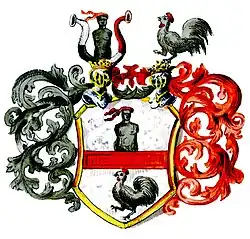 „Wappen: In Silber ein roter Balken. Oben wachsend ein Mohrenrumpf mit goldener Stirnbinde, unten ein schwarzer Hahn (Streithahn).“