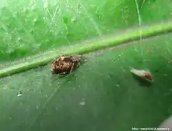 Eine kleine Spinnenart, die 2,5–3,5 mm lang wird. Vorne auf dem Hinterleib befindet sich ein ovaler Dunkelfleck und dahinter angedeutete Querlinien. Die Beine sind heller als der Körper.