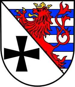 Im schräggeteilten Schild vorne in Silber ein schwarzes Tatzenkreuz, hinten in Silber vier blaue Balken, belegt mit einem roten, goldgekrönten, wachsenden Löwen.