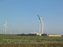 Die Gemeinde wird von Landwirtschaft und Windenergieanlagen geprägt. Im Jahr 1993 entstanden zehn Anlagen. Mit einer Leistung von 2,25 MW handelte es sich damals um den größten Windpark Deutschlands.[8] 1994 entstanden vier weitere Anlagen. Alle wurden 2010 im Repowering 2010 durch sechs neue Enercon-Anlagen[9], drei REPower-Anlagen[10] und zwei weitere ersetzt. Die alten Anlagen kamen nach dem Abbau zum Teil nach Polen.[9] Die Anlagen haben jeweils eine Nabenhöhe von etwa 100 Metern und eine Gesamthöhe von etwa 130 Metern.[10]