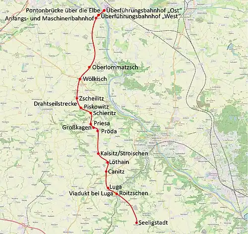 Die Strecke überquerte auf einer 28,6 m langen Holzbrücke die noch im Bau befindliche Schmalspurbahn Wilsdruff–Gärtitz und führte über Canitz zur achten Telefonstation bei Luga. Auf dem 23 m hohen und 280 m langen hölzernen Viadukt bei Luga überquerte sie das Tal der Triebisch und führte zur neunten Telefonstation in Roitzschen. Von dort überquerte sie die Bahnstrecke Borsdorf–Coswig und führte über Sönitz zur zehnten Telefonstation beim Endbahnhof in Seeligstadt.[3][9][10]