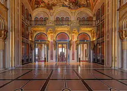 Die in der ersten Etage befindliche Ruhmeshalle ist mit Fresken von Karl von Blaas verziert. Sie entstanden in den Jahren von 1858 bis 1872 und zeigen die wichtigsten militärischen Ereignisse aus der Geschichte Österreichs seit den Babenbergern.[4] In den vier großen Wandbögen sind die Schlacht bei Nördlingen (1634), der Kriegsrat in der Schlacht bei St. Gotthard (1664), die Schlacht bei Zenta (1697) und der Entsatz von Turin (1706) dargestellt; im linken Nebensaal die Ereignisse aus der Regierungszeit Maria Theresias und Josephs II. bis zur Einnahme Belgrads 1789; im rechten Nebensaal die Napoleonischen Kriege von der Schlacht bei Würzburg 1796 über den Tiroler Volksaufstand von 1809 bis zu den Waffenstillstandsverhandlungen von Feldmarschall Radetzky mit König Vittorio Emanuele II. von Sardinien nach der Schlacht bei Novara 1849.
