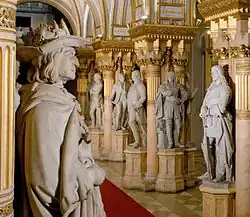 Im Inneren des Heeresgeschichtlichen Museums manifestiert sich die Absicht Kaiser Franz Josephs, nicht bloß ein Gebäude für die kaiserlichen Waffensammlungen zu errichten, sondern auch eine Ruhmes- und Gedenkstätte für die kaiserliche Armee zu schaffen. So sind in der Feldherrenhalle 56 ganzfigurige Porträtstatuen der „berühmtesten, immerwährenden Nacheiferung würdiger Kriegsfürsten und Feldherren Österreichs“, wie es in der kaiserlichen Entschließung vom 28. Februar 1863 heißt, aufgestellt.[3] Die Statuen sind in Carraramarmor ausgeführt und mit 186 cm alle einheitlich hoch. Namen und Lebensdaten der Dargestellten sind oberhalb der Figuren auf Tafeln angebracht, auf den Sockeln sind die 32 verschiedenen Namen der ausführenden Künstler, der Zeitpunkt der Aufstellung und der Mäzen genannt, der die Herstellung der jeweiligen Skulptur finanziert hatte. Die Kosten für die Hälfte der Statuen trug Kaiser Franz Joseph, der Rest wurde von privaten Gönnern gestiftet, oftmals handelte es sich dabei um Nachkommen des jeweils porträtierten Feldherren.