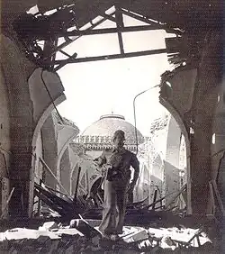 Mit dem Einsetzen der alliierten Luftangriffe auf Wien ab Herbst 1943 wurden, wie bei allen Wiener Museen, die wertvollsten Bestände ausgelagert. Diese Maßnahmen erwiesen sich als richtig: Am 10. September und 11. Dezember 1944 sowie am 15. Jänner 1945 wurden das Arsenal und der benachbarte Südbahnhof von alliierten Bomberverbänden derart stark in Mitleidenschaft gezogen, dass nicht nur das Museumsgebäude, sondern auch zahlreiche Depots von Bomben getroffen und stark beschädigt bzw. zerstört wurden.[14] Gegen Ende des Krieges, vor allem 1945 im Verlauf der sogenannten Schlacht um Wien, wurde das Arsenalgelände ebenso schwer in Mitleidenschaft gezogen.
