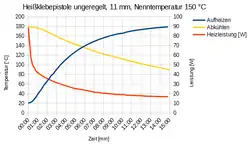 Das Heizelement einfacher elektrisch beheizter Geräte hat Kaltleiter-Eigenschaften. Dadurch ist die Heizleistung in kälterem Zustand während der Anheizphase und bei großem Durchsatz höher als im aufgeheizten Zustand bei geringem oder keinem Durchsatz. So wird die Heizleistung zu einem gewissen Grad an den Bedarf angepasst. Durch länger andauernden schnellen Vorschub der Klebestange kann die Schmelzkammer dennoch soweit abkühlen, dass sich der Ausfluss des Klebstoffs mangels ausreichender Verflüssigung stark verlangsamt. Ein kontinuierlicher Betrieb von einfachen Geräten ohne Temperaturregelung ist daher in der Regel auf einen geringen Klebstoff-Durchsatz beschränkt. Dadurch reduziert sich der Einsatzbereich auf punktuelle oder linienförmige Verklebungen von schlecht wärmeleitenden, flexiblen Materialien, die sich nach und nach mit dem Klebstoff belegen und niederdrücken lassen.