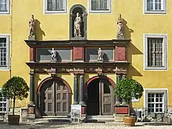 Der Schlosshof ist rund 150 Meter lang. Des Schlosses Südflügel beruht weitgehend auf der Bausubstanz des Vorgängerbaus. Der neue Hauptflügel wurde im Westen des Hofes errichtet. Sein Zentrum ist ein prunkvoller Festsaal, der heute noch zu besichtigen ist und für kulturelle Veranstaltungen, wie Schlosskonzerte, genutzt wird. Ihm ist von jeder Seite eine repräsentative Raumfolge zugeordnet. Der Nordflügel war als Verwaltungssitz für die fürstlichen Ministerien vorgesehen und wurde durch mehrere kleinere Wirtschaftsgebäude, unter anderem den Marstall, erweitert. Als letztes größeres Bauwerk dieser Phase wurde 1744 der 40 Meter hohe Schlossturm errichtet.