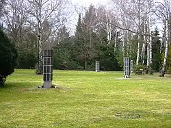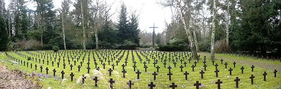 Auf dem Heidefriedhof gibt es eine Gedenkstätte für Kriegsopfer. Sie umfasst 624 Einzelgräber und ein Sammelgrab, in denen Soldaten des Zweiten Weltkrieges und Zivilisten bestattet sind.[2] In den letzten Kriegsmonaten mussten vermehrt Bestattungen vorgenommen werden, so dass die vorhandenen, innerstädtischen Friedhöfe bald an ihre Grenzen stießen. Um die Seuchengefahr einzudämmen, wurden Notbegräbnisstätten eingerichtet, beispielsweise auf dem Bäumerplan am St. Josef-Krankenhaus (das ehemalige Reservelazarett Nr. 111) oder am Wenckebach-Krankenhaus (ehemaliges Reservelazarett Nr. 122). Hier wurden rund 250 bzw. 350 Tote bestattet. Auf Veranlassung des Gartenbauamtes wurden im März 1952 diese Toten aus hygienischen Gründen in Einzelgräber umgebettet. Tote, deren Identifikation nicht mehr möglich war, wurden in einem Sammelgrab bestattet, welches mit einem 9,5 Meter hohen Holzkreuz gekennzeichnet wurde. 2002 erfolgte eine Erneuerung der Grabkreuze. Dabei wurden die Daten der Toten vervollständigt,[2] im Winter 2016 wurde das große Holzkreuz restauriert; von August bis November 2017 erfolgte ein Austausch der kleinen Holzkreuze gegen Kreuze aus dunklem Granit.