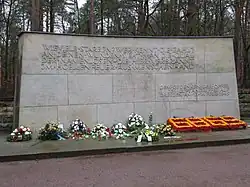 Nach dem Krieg war zunächst ein Holzkreuz aufgestellt worden, das gegenüber der Feierhalle den Eingang zu den Anlagen der „Opfer von Krieg und Faschismus“ markierte. Seit 1964 markiert gegenüber der Feierhalle ein hoher Obelisk mit dem Zeichen der Internationalen Föderation der Widerstandskämpfer (FIR – Fédération Internationale des Résistants) den Eingang zum Ehrenhain. Die daneben errichtete Mauer trägt die Inschrift: Zum Höchsten der Menschheit emporgestrebt.[2]